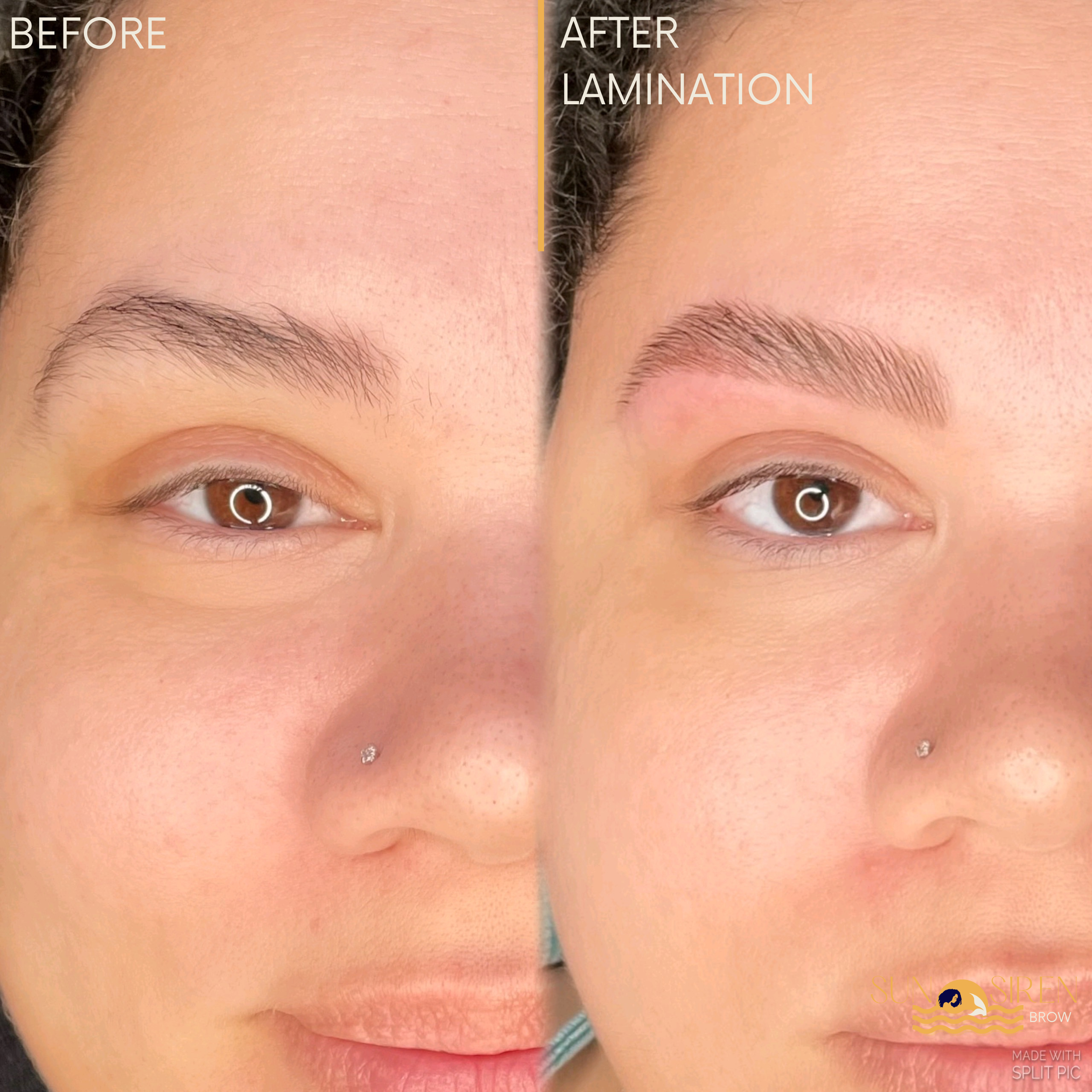 Lamination can transform your brows from ordinary to extraordinary! Its ability to restructure and redefine the brows, providing a sleek and polished appearance, makes it a highly sought-after treatment at Sun Siren Brow and an overall fun service to perform on my clients. If you pair your lamination with tint or stain, the brows can be really dark initially which lightens after the first wash. If you are planning on attending an event or doing it for a special occasion, tell your artist ahead of time so they can adjust the processing time of the tint or stain.