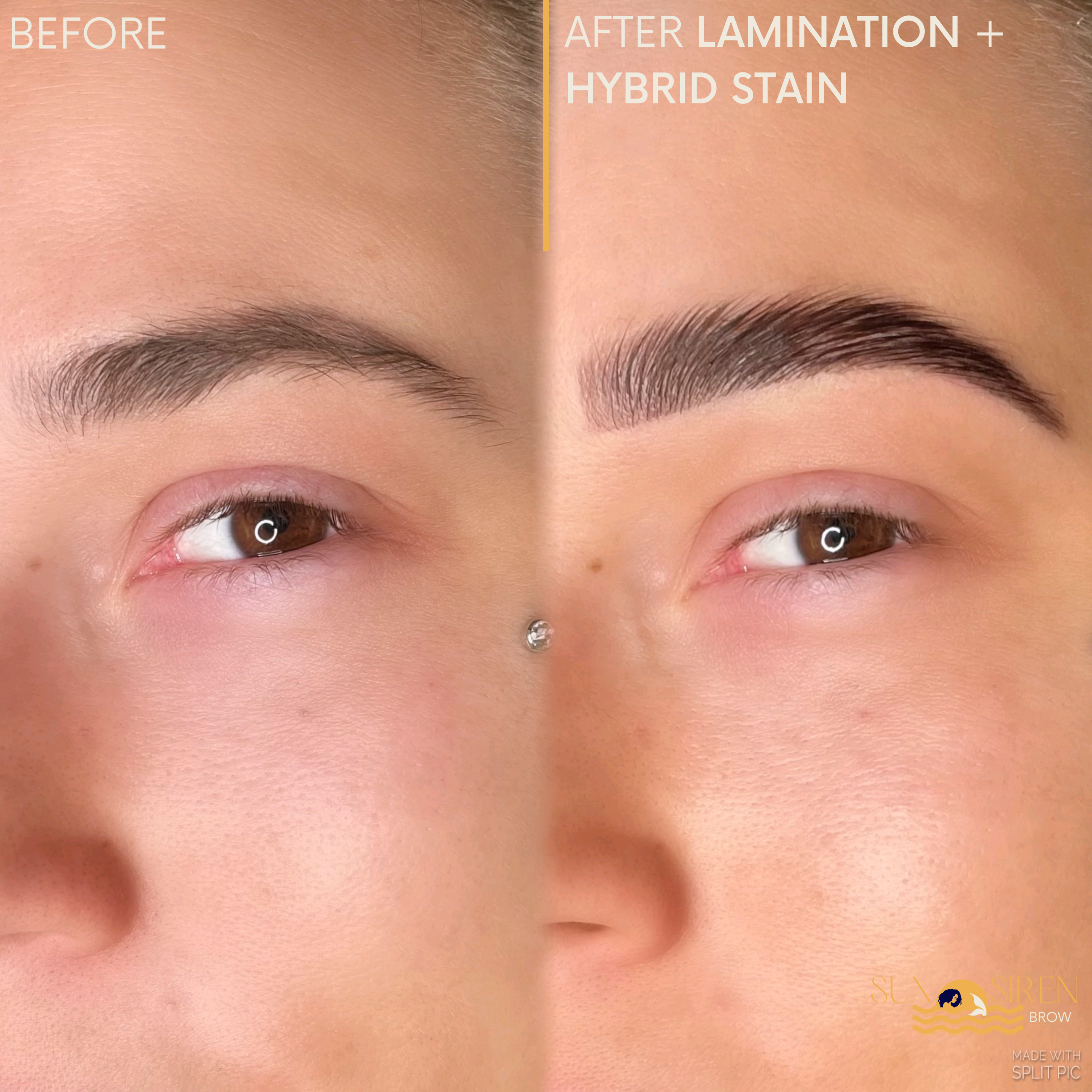 Image Left: Brow Lamination Before and After with Hybrid Tint (Stain)